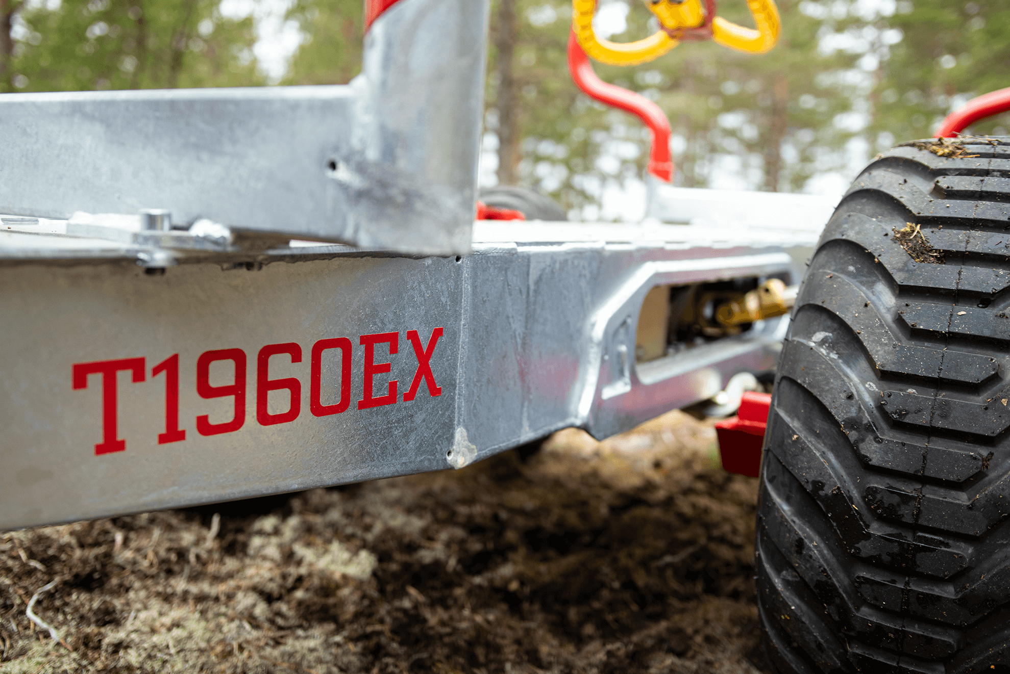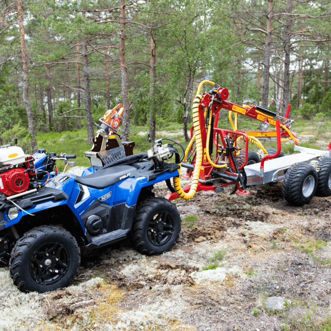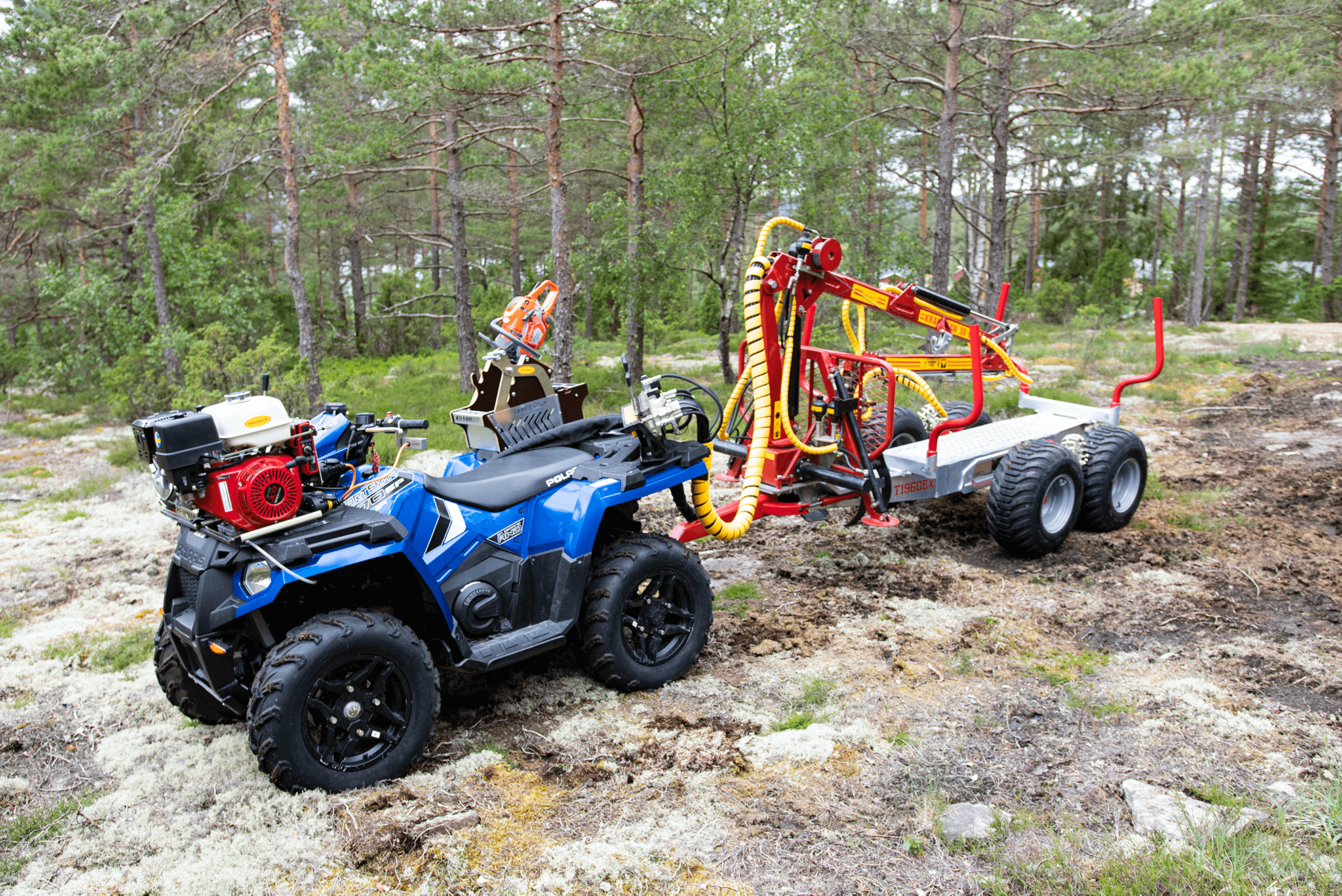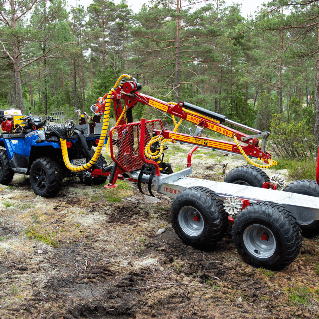 The T1960ex has a stable double-wall chassis to achieve a torsionally rigid design with high clearance under the crane plate as well as at the rear. The trailer is richly standard equipped with high and low gears, self-developed powerful wheels, Honda GX390 with electric start, neutral position valve, brake valve and 2 banks with 4 stakes. The frame control is electro-hydraulic so when driving, the drive is not affected. M36 pro crane, radio controlled winch, 4 swivel speeds, steel or plastic strap, trailerextension with up to 5 banks are some of the options available. The cylinders fore the drive rollers are positioned lying down on the bogie as it is possible to have tracks on the trailer. The trailer has deprotection during the drive, As soon as you brake the ATV the trailer will also stop. Brake valve is standard on the trailer, you can adjust the braking action on the trailer so it does not pushe the ATV in slopes. The brake valve is activated automatically when you brake with the ATV.