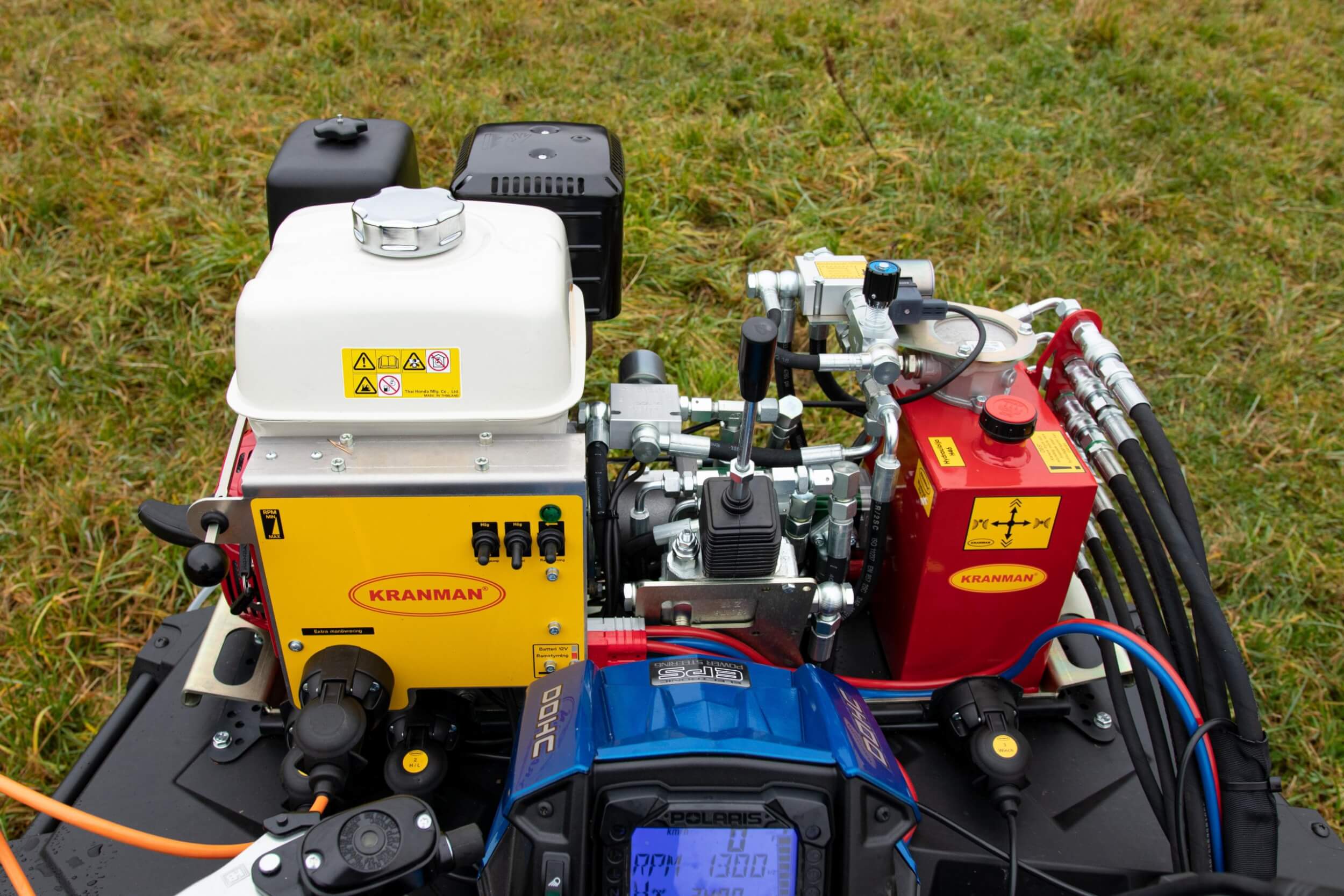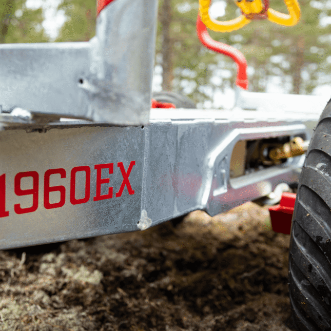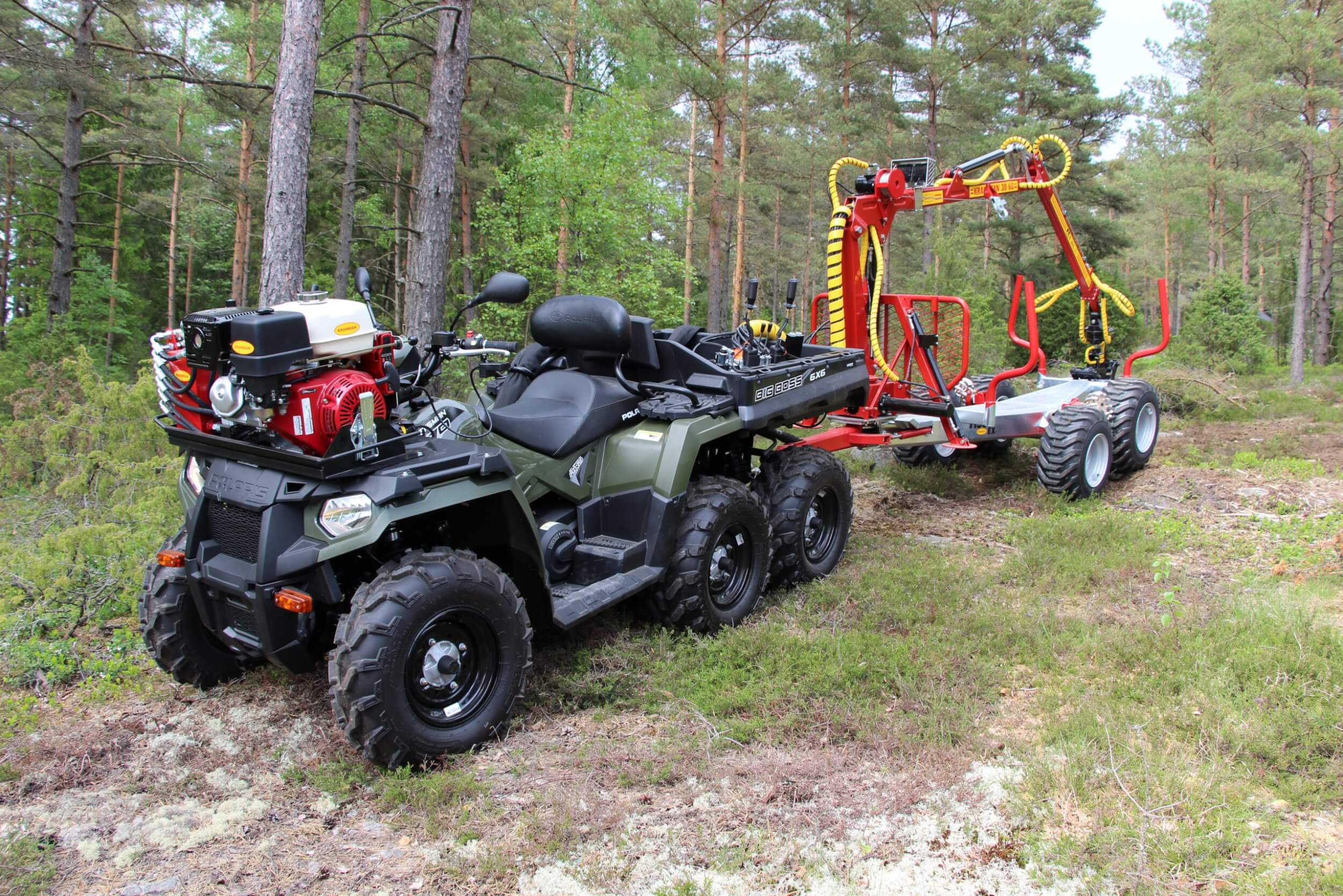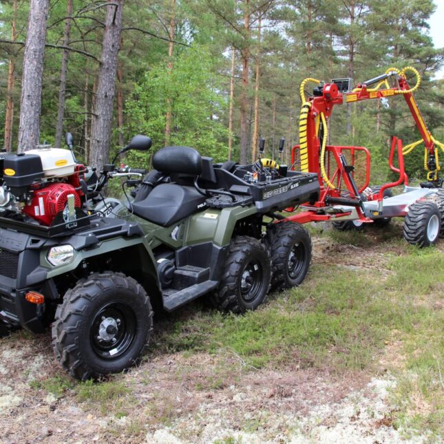 The T1960ex has a stable double-wall chassis to achieve a torsionally rigid design with high clearance under the crane plate as well as at the rear. The trailer is richly standard equipped with high and low gears, self-developed powerful wheels, Honda GX390 with electric start, neutral position valve, brake valve and 2 banks with 4 stakes. The frame control is electro-hydraulic so when driving, the drive is not affected. M36 pro crane, radio controlled winch, 4 swivel speeds, steel or plastic strap, trailerextension with up to 5 banks are some of the options available. The cylinders fore the drive rollers are positioned lying down on the bogie as it is possible to have tracks on the trailer. The trailer has deprotection during the drive, As soon as you brake the ATV the trailer will also stop. Brake valve is standard on the trailer, you can adjust the braking action on the trailer so it does not pushe the ATV in slopes. The brake valve is activated automatically when you brake with the ATV.