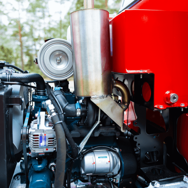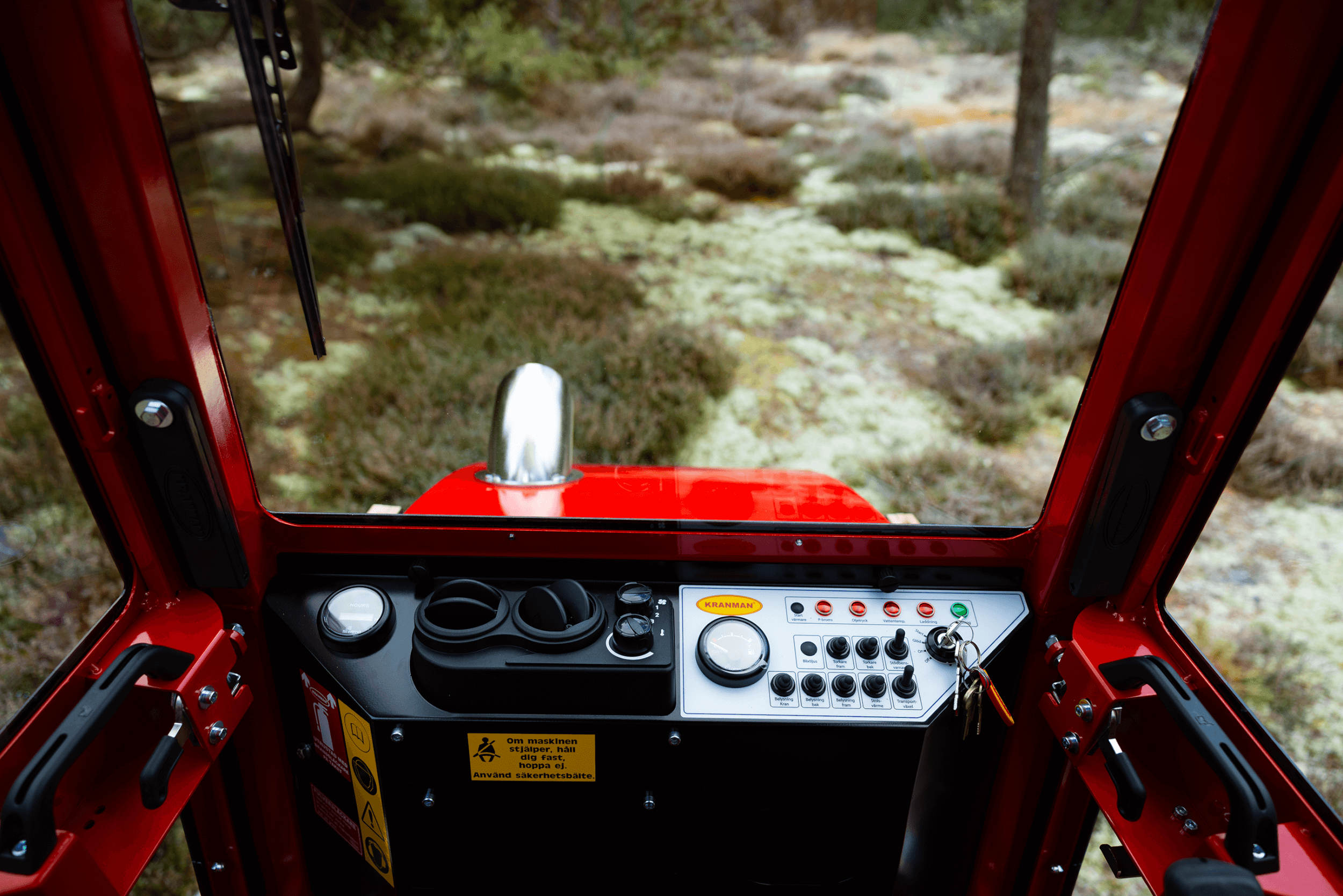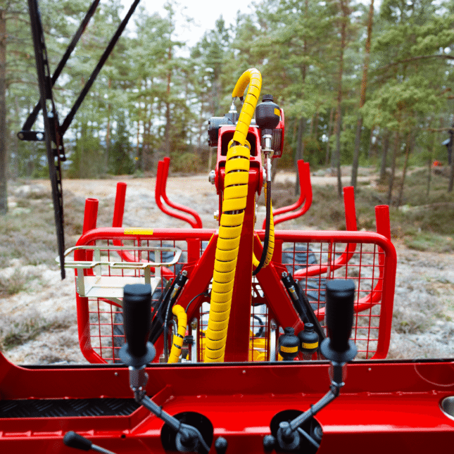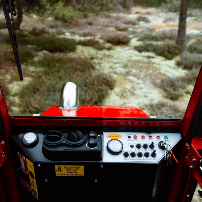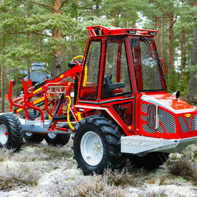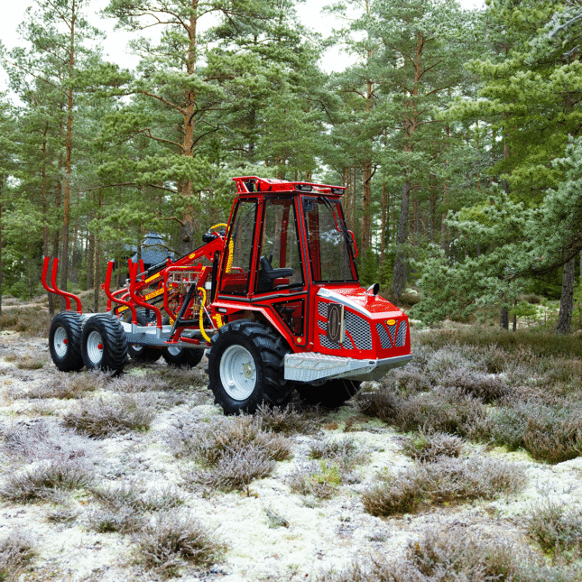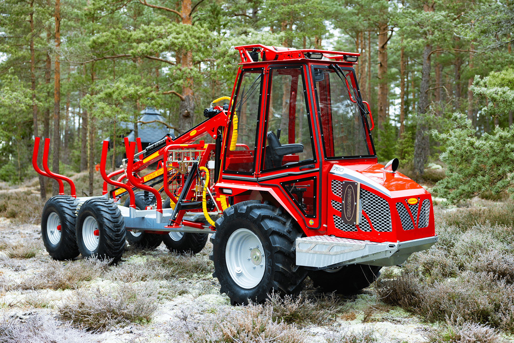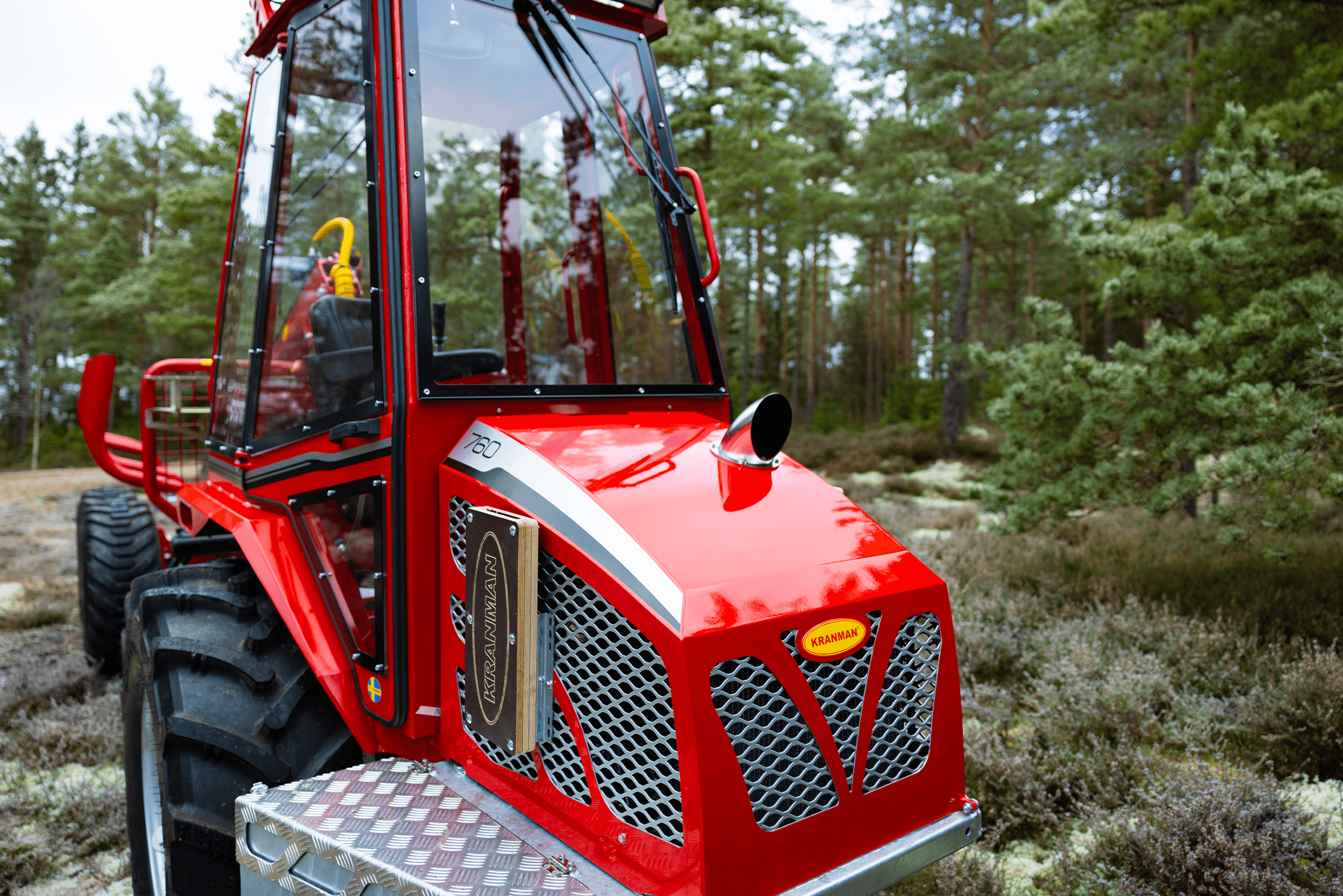Kranman 760 – The next generation of class-leading mini forwarders is here After the very successful launch of the Kranman 650 and 660, it is now time to present the next forwarder in Kranman’s new forwarder series, the Kranman 760. The Kranman 760 replaces the Bison 10000. It is available in three different designs: Comfort, Pro and Pro+. All trim levels of the Kranman 760 have a cab with waterborne heating and are combi prepared, which enables the installation of the Jobo ST35 harvester head. The diesel engine is based on Kubota’s well-proven D902. It is a three-cylinder engine with 25 hp. To get extra power, we have chosen to install the D902-T, which means that it is turbocharged. This increases the torque from 56 Nm to 78 Nm, which is clearly noticeable in this powerful machine. The stainless steel exhaust system is integrated under the hood which makes it well protected. The machine has stepless drive via hydrostat. The driving force has increased by a whopping 30%. This is due to the new powertrain that has a lower gear ratio, more powerful hydrostats and the turbocharged engine. The chassis is completely newly developed and is both torsionally stiffer and more powerful. The load-bearing structure in the rear is made of the high-strength steel Domex 650, which means that the load capacity has been increased to 2700 kg. To reduce vibrations and noise levels, the newly developed cab for this model series is rubber-suspended. The chassis design allows the Kranman 760 to have a flat cabin floor. This makes it easy to enter the cab and there is plenty of room for your legs. The large curved window provides a very good view when loading and driving backwards. The Pro and Pro+ trim levels have double-arm wipers both front and rear. Storage space is one thing that has been prioritized in the development work. In the cab, we have placed a compartment under the seat, a compartment in the dashboard with USB sockets, compartments on both screens, compartments for mobile phones, cup holders, as well as a hook for a jacket and a hook for a chopper’s helmet. On the outside, we have placed large compartments on both sides of the motor for storing tools, for example. On the hood there is a chainsaw holder and on the gate a combi can holder. In the Pro+ version, there is also a storage basket on the gate. The waterborne heat provides an even and good heat in winter. For good ventilation in the summer, we have developed smart ventilation locks in flexible rubber that are mounted on both doors. To further increase serviceability, we have placed service hatches at all important service points. There are hatches under the engine, under the front axle, on the front side, in the cab floor and on the top of the rear car. The Kranman 760 has very good lighting. The Pro and Pro+ also have cross-lighting through lamps that are protected in the shades. This increases the light pattern and reduces shadow formation. The hydrostatic drivetrain causes the machine to stop and stand still when you release the drive pedal. When loading or parking on an incline, however, you need a brake to stand completely still. Therefore, the Kranman 760 is equipped with a hydraulic handbrake that is automatically activated when the machine is put in neutral. The Pro and Pro+ are also equipped with outrigger warning with automatic braking. To facilitate cold starts, the Pro is equipped with an electric 230v engine heater. The Pro+ is equipped with a diesel heater that is either controlled via timer or SMS. Fuel consumption is about 2 litres per hour, which gives just over 12 driving hours with the new larger tank of 24 litres. The diameter and tread depth of the front wheels have increased on the Kranman 760 compared to its predecessor. This means that the ground clearance at the front is 38 cm and that grip and steering ability have been significantly improved. The width of the machine is only 155 cm. In Comfort version, the Kranman 760 is delivered with our newly developed crane KX30. On the Pro and Pro+ is the professional crane M36.