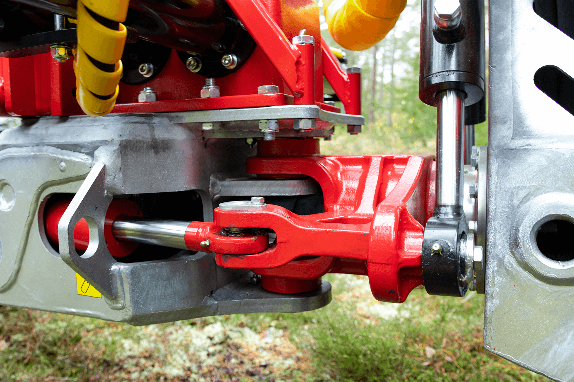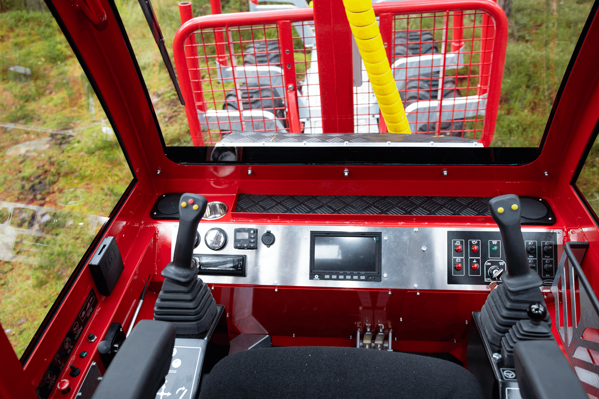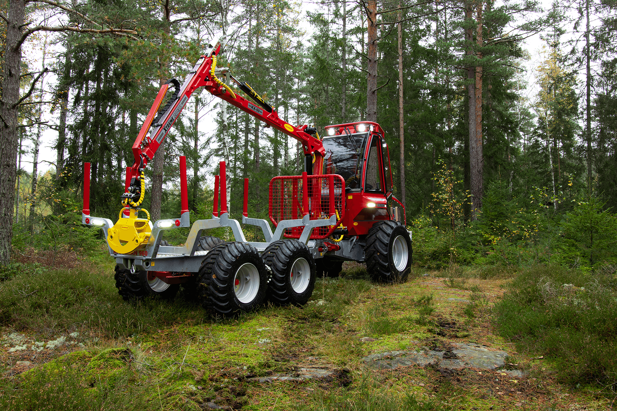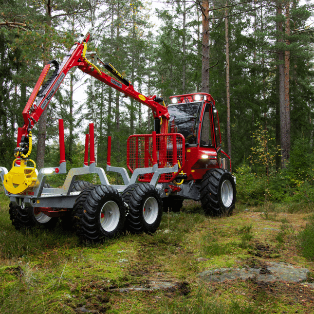 With this machine, we move the level further in the segment and we are incredibly proud of the result. It’s more powerful than ever with a four-cylinder 1.5-litre diesel engine from Kubota. The engine has a high torque. This, combined with a more powerful drivetrain and the large wheels, gives the machine extreme off-road capability. The drivetrain consists of a double rental thermostat in which one pump goes to the front wheels and one goes to the rear wheels, as well as a gear pump for crane and steering. The machine has 6-wheel drive in high and low gear. On the transport gear, it is front-wheel drive. A machine in this class requires an automatic waist lock. This, together with our automatic parking brake, makes the machine even more efficient. Waist lock and parking brake are activated when you release the driving pedal. Kranman 960 has a heavy-duty molded waist with well-protective waist lock cylinders and integrated steering cylinders in the reartrailerone. Most of the development work we have put on the cab. The cab is rubber suspended and foldable with double cabin floors and three insulated torpedo walls facing the engine compartment. This means that we get a noise level of a very low 76 db at full engine speed. That’s far below the requirements for hearing protection and arguably class-leading. Thanks to the spacious cab and the curved window, you get a very good all-round view. The very comfortable seat is air-cushioned in height and also cushioned. With the servo levers located in the armrests, you control both the crane and the machine’s control. The servo hydraulics make the crane easy to operate with precise precision and high reliability. Both AC and app-controlled diesel heaters are found in the various equipment packages. The storage options are very well sized and cleverly placed. With powerful cross-directional LED lights, shadow formation is minimized and an even pleasant light image is created. On Kranman 960 sits our completely newly developed crane KX50 Extreme series. The crane is developed with a focus on strength and optimized movement pattern. Thanks to our 4-point comfort joint and fast protrusion, forwarding becomes efficient and easy. Of course, our most powerful winch HV1000 is mounted. The machine is supplied with swivel stakes or forwarder bunks. Regardless of the choice, the bunks are movable in a total of 15 different steps, which means great flexibility.