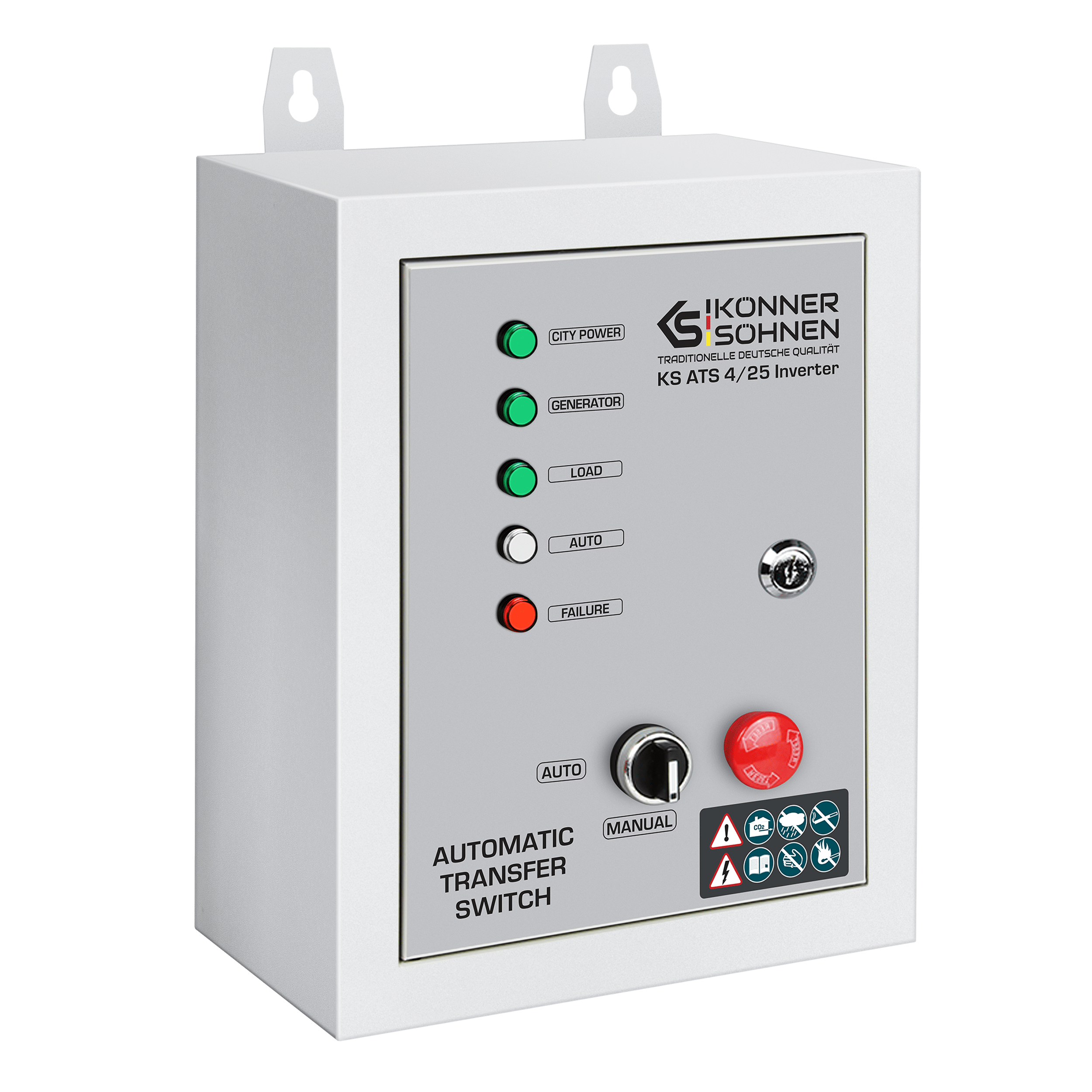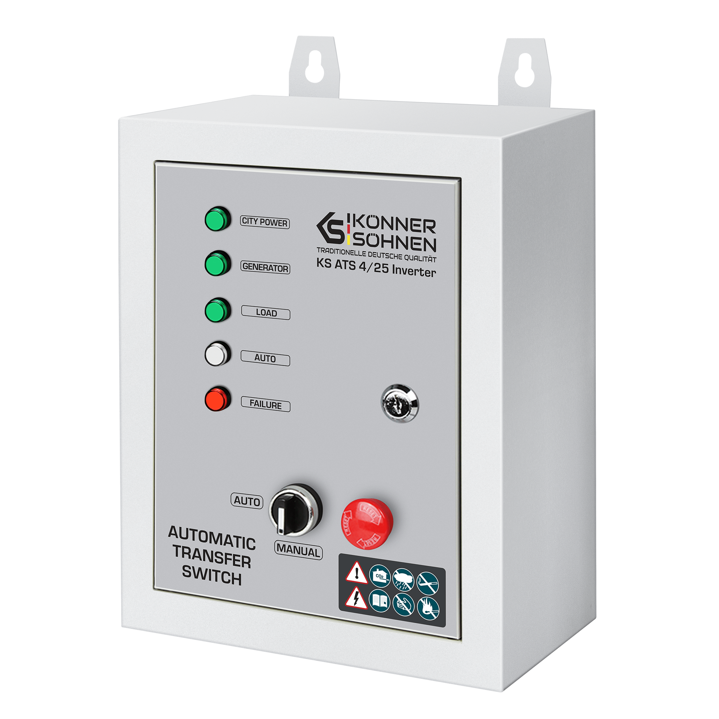 Saksa kaubamärgi “Könner & Söhnen” KS ATS 4/25 inverter ATS (automaatne ülekandelüliti) seade käivitab automaatselt generaatori ja lülitab koormuse sellele, kui peamine toiteallikas on välja lülitatud, ning peatab automaatselt generaatori, kui keskne toiteallikas taastatakse. See on ühilduv “Könner & Söhnen” KS 5500iES ATSR invertergeneraatoriga, millel on integreeritud 7-kontaktiline ATS pistik. ATS-seadmel on PLC mootori käivitamise aja programmeerimiseks pärast voolukatkestust, mootori soojenemisaja programmeerimiseks enne tarbijate ühendamist ning vigade signaalimiseks. Sellel on generaatori hädaseiskamise nupp. ATS-seade saab töötada nii automaatrežiimis kui ka käsitsi režiimis.