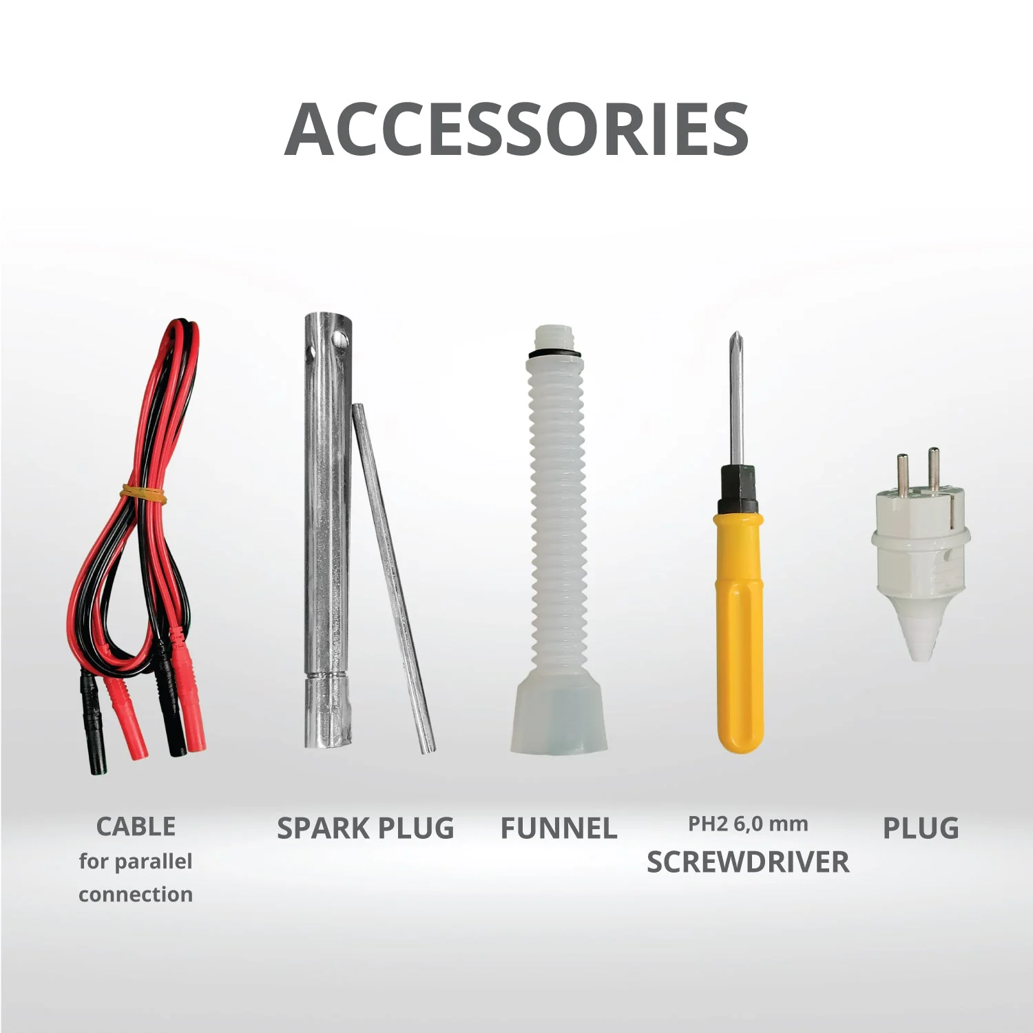 Generaator on varustatud lisatarvikutega: süüteküünla mutrivõti, täitelehter, paralleelühenduse kaabel, 16 А Schuko pistik, PH2 kruvikeeraja 6,0 mm.