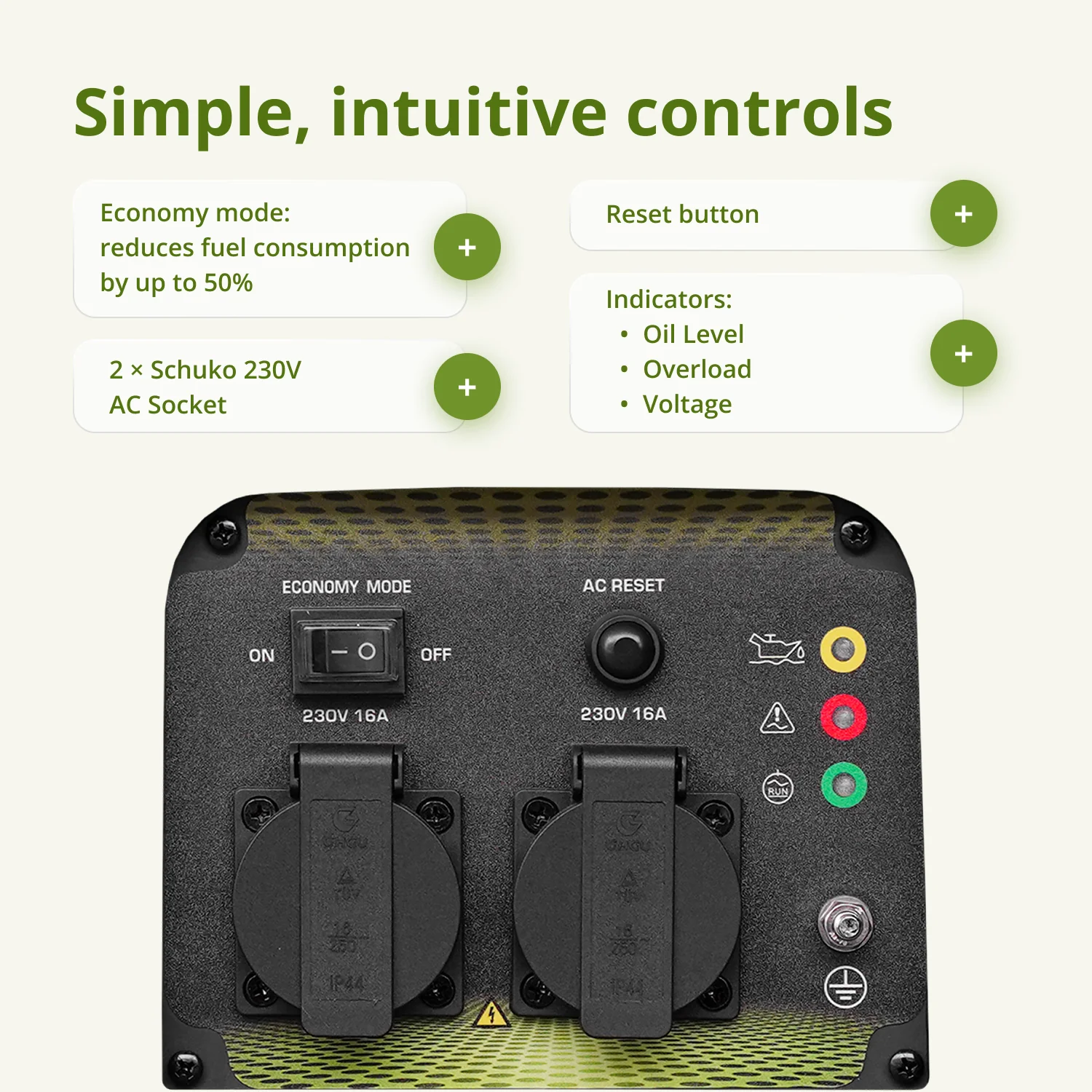 Invertertehnoloogia – tagab stabiilse väljundpinge õige siinuslaine kujuga, sobib tundlike elektroonikaseadmete usaldusväärseks tööks.Usaldusväärne toiteallikas – ideaalne valik koju, suvilasse, telkimiseks või tööruumi, eriti elektrikatkestuste ajal või kohtades, kus puudub juurdepääs statsionaarsele toiteallikale.Vaikne ja stiilne korpus – kaasaegne disain koos heliisolatsiooniga vähendab müra mugavale tasemele — ideaalne kasutamiseks elamupiirkondades ja looduses.Kompaktsed mõõtmed – K&S Basic invertergeneraatorite kompaktne suurus ja väike kaal muudavad need mugavaks kasutada, lihtsaks transportida ja hoiustada.100% vasegeneraatori mähis – tagab stabiilse elektritootmise, vähendab ülekuumenemise riski ja pikendab seadme kasutusiga.