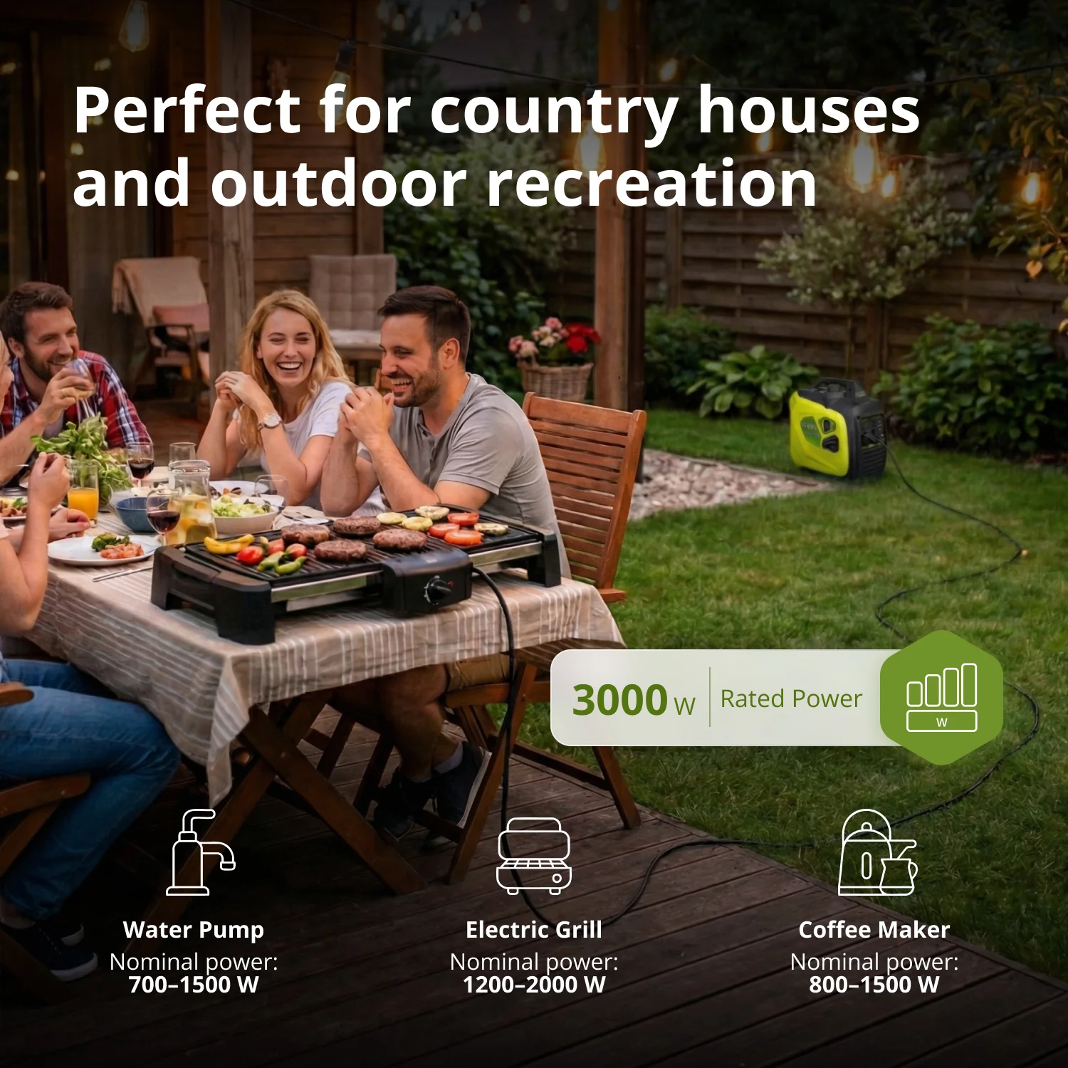 Kompaktsed mõõtmed: Selle mudeli kompaktne suurus võimaldab seda kõikjale kaasa võtta. See muutub usaldusväärseks abiliseks väljasõitudel, telkimisel, kalapüügil, pakkudes vajalikku energiat.