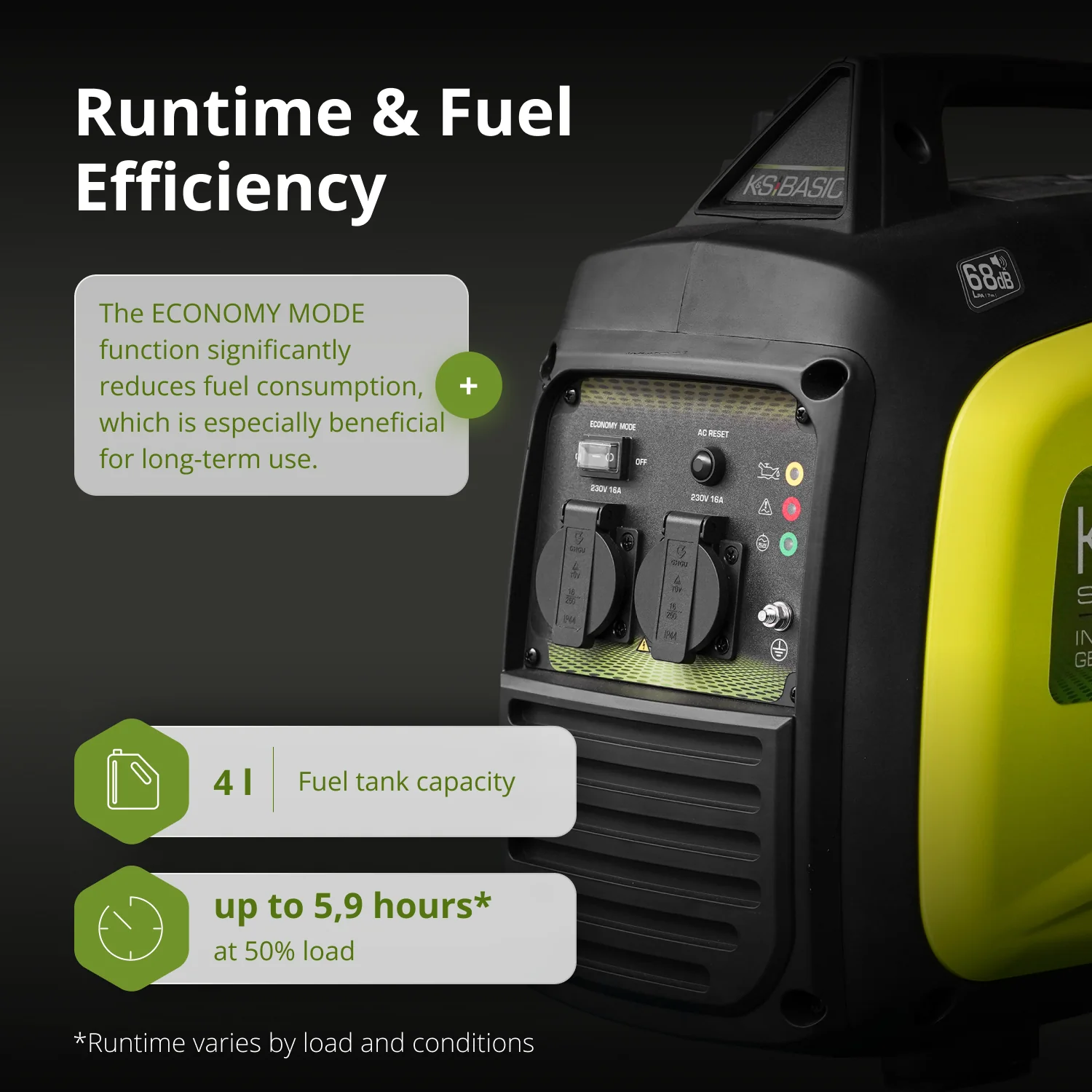 Kõrgeima klassi esinduslik disain: Moodne, läbimõeldud korpuse disain ei anna mitte ainult esteetilist välimust, vaid aitab kaasa ka seadme stabiilsele tööle. Heli neelavad materjalid vähendavad mürataset 68 dB-ni 7 meetri kaugusel, muutes generaatori mugavaks kasutamiseks nii kodus kui ka looduses.