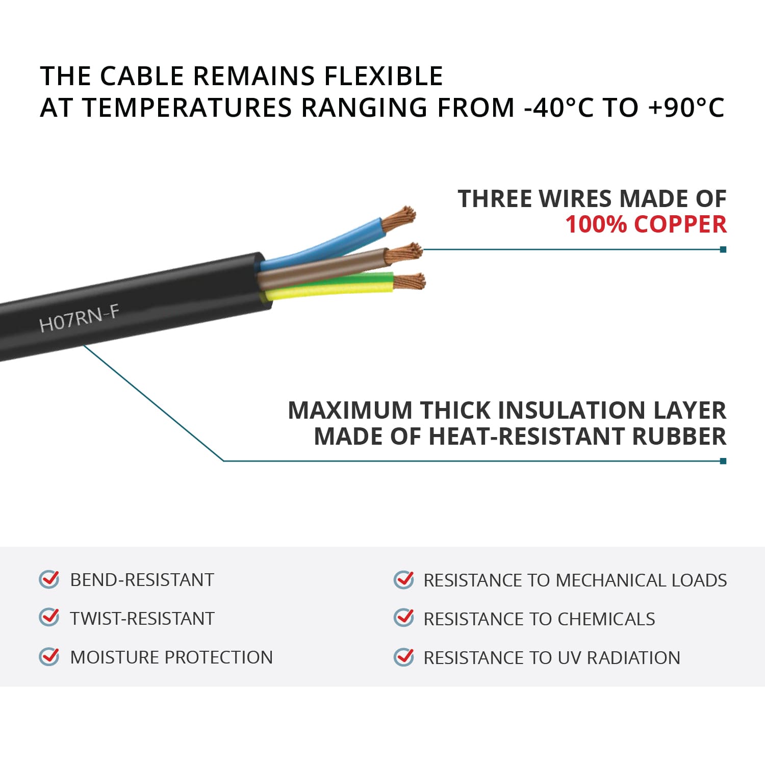 Kummist pikenduskaabel on täielikult kaitstud niiskuse, tööstus- ja põllumajanduskemikaalide, päikesevalguse ja tahkete osakeste eest. Säilitab oma elastsuse igal temperatuuril, mis võimaldab seda kasutada igal aastaajal nii siseruumides kui ka väljas. Rulli pistikupesad on varustatud kaitsekatetega.