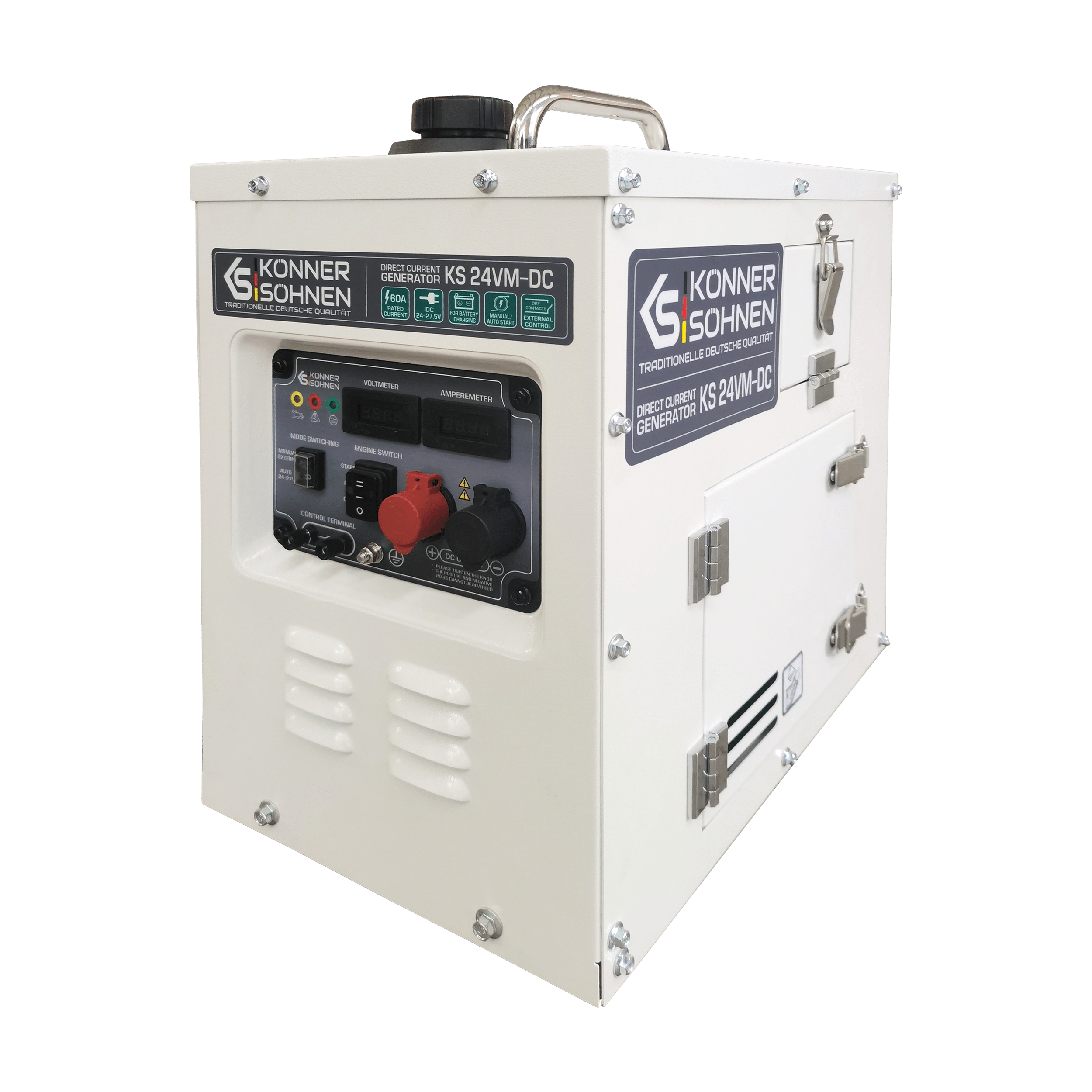 Saksa brändi Könner & Söhnen® 60A (24–27,5V) konstantse pingega generaator on võimas ja usaldusväärne varulaadija, mis on mõeldud 24V akudele. Laadimine alalisvoolugeneraatoriga on väga tõhus, ei vaja täiendavat pingemuundamist ja säästab kütust võrreldes tavaliste vahelduvvoolugeneraatoritega. Sellel on AUTO-režiim, mis töötab laadijana, ja MANUAL/EXTERNAL-režiim käsitsi käivitamiseks või välise seadme kaudu käivitamiseks. Vastupidav metallkorpus vähendab müra ja kaitseb kahjustuste eest. Samuti on see varustatud jälgimissüsteemiga.