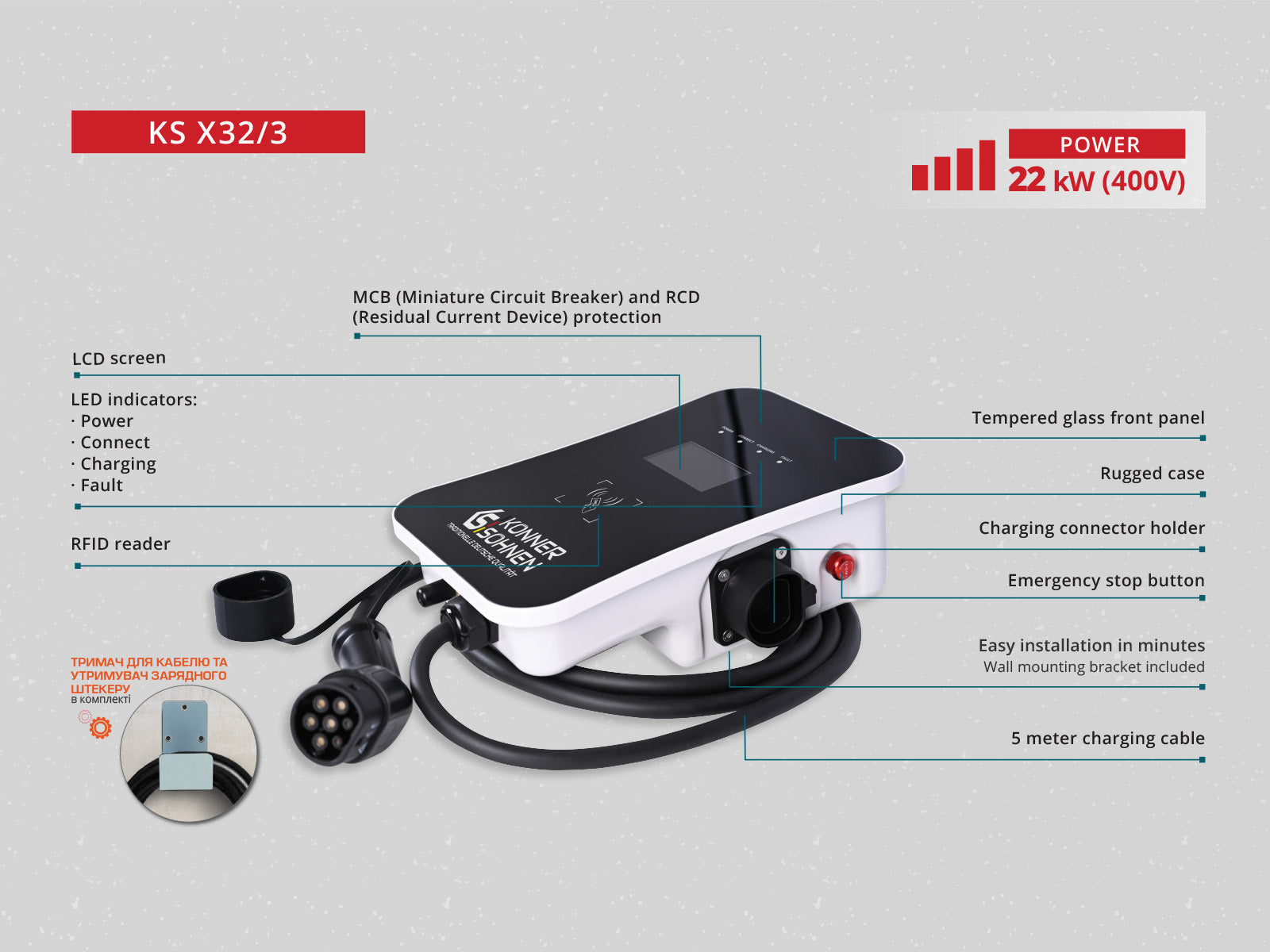 Könner & Söhnen® KS X seeria elektrisõidukite laadimisjaamad on varustatud IP54 korpusega, mis sobib kasutamiseks välitingimustes vihma ja lume korral. Korpus kaitseb seadet veepritsmete eest, mis võivad korpusele sattuda igast suunast. 4,3-tolline LCD-ekraan kuvab asjakohast teavet ja LED-tuled näitavad laadimise olekut. Vastupidav korpus on valmistatud kvaliteetsetest materjalidest, esipaneel on karastatud klaasist.