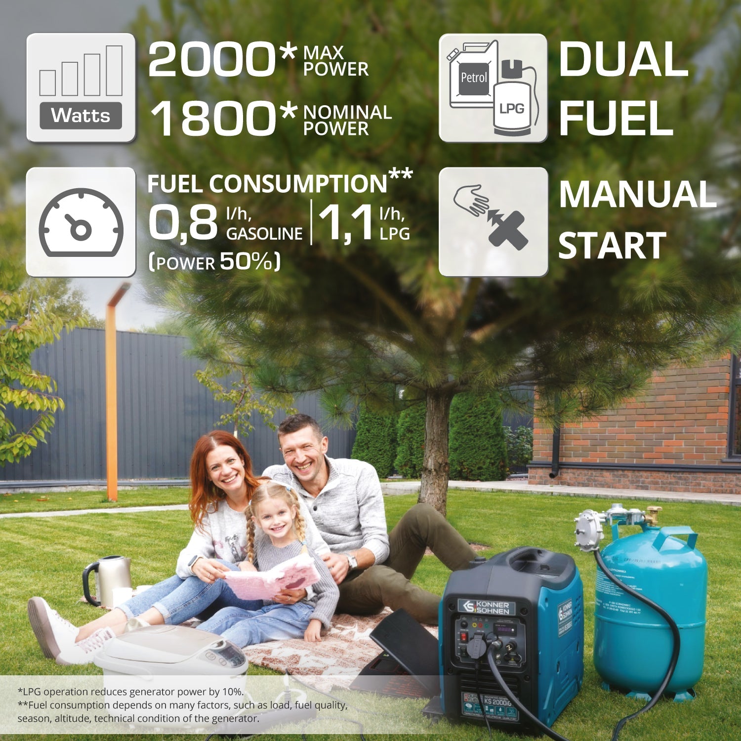 Generaator töötab nii bensiinil kui ka veeldatud gaasil (propaan-butaan) ning sisaldab kõike vajalikku LPG kütusena kasutamiseks: voolik koos reduktoriga, mis tagab gaasiballooni usaldusväärse ühenduse. Lihtsalt ühendage generaator gaasiballooniga ja käivitage mootor.