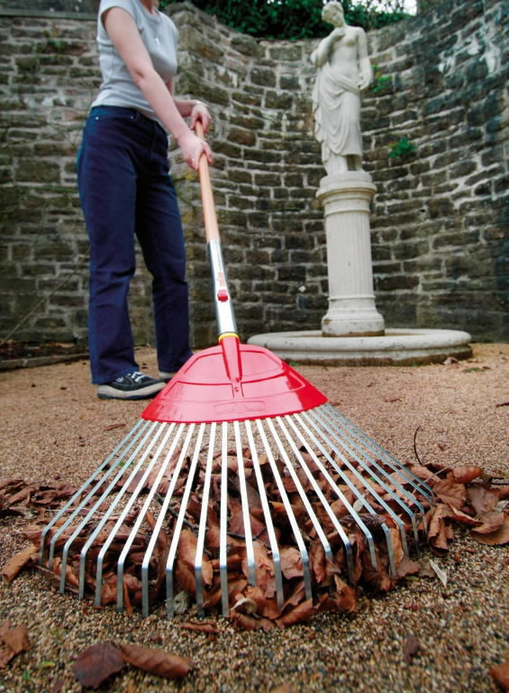 Sitkest vedruterasest valmistatud piidega 50 cm laiune reha lehtede, niidetud muru ja prahi kokkuriisumiseks.