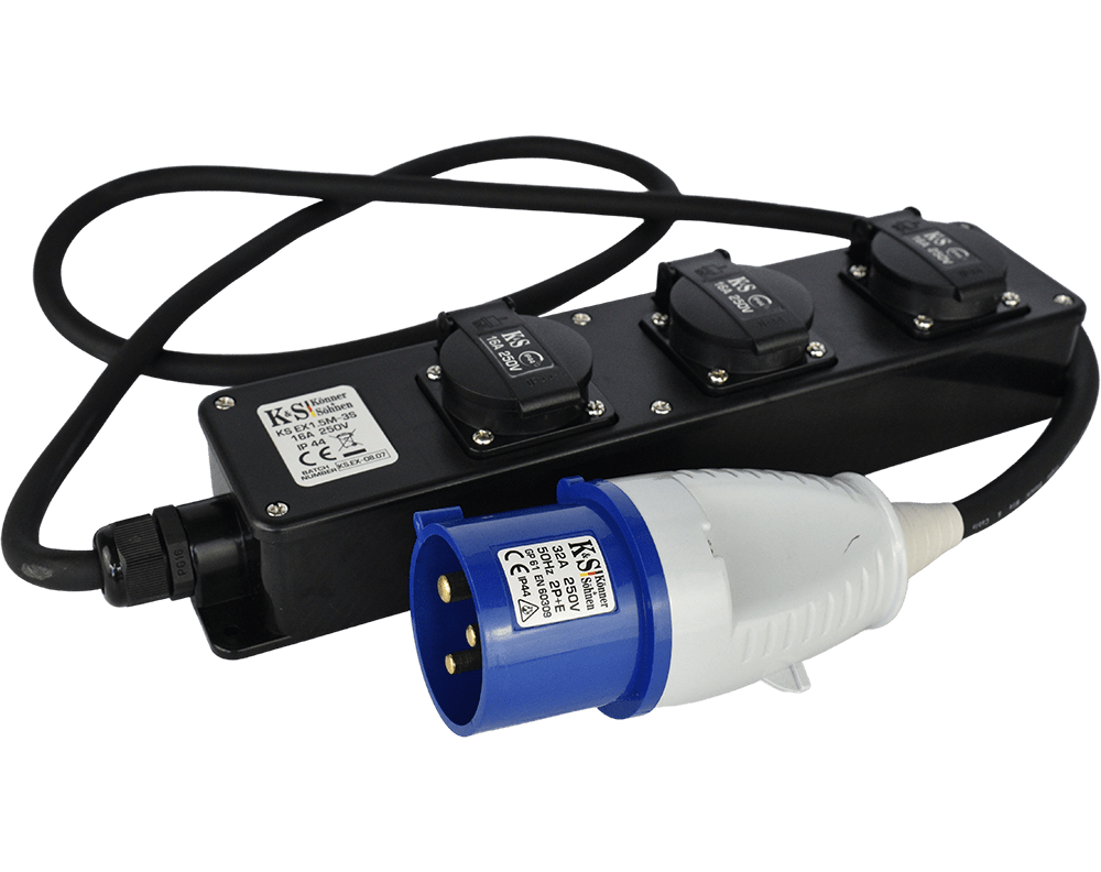 KS EX1.5M-3S pistikupesa adapter 3 pistikupesaga ja kaabli pikkusega 1,5 mPistikupesa adapterit kasutatakse, kui on vaja ühendada kodumasinaid tavalise 16A pistikupesaga 32A pistikupesagaSellel on kaitseklass IP44, mis võimaldab seda kasutada välitingimustes ja kõrge niiskuse korral100% vaskkaabel