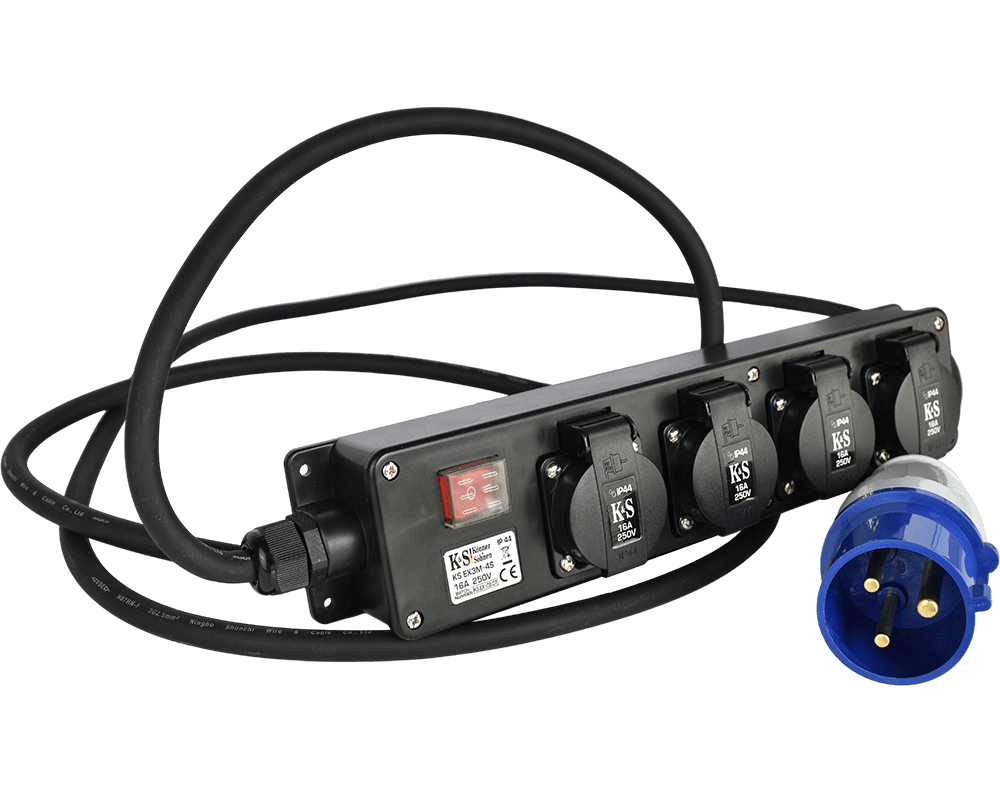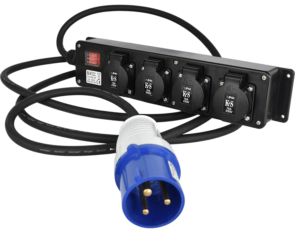 KS EX3M-4S pistikupesa adapter 4 pistikupesaga ja kaabli pikkusega 3 mPistikupesa adapterit kasutatakse, kui on vaja ühendada kodumasinaid tavalise 16A pistikupesaga 32A pistikupesagaSellel on kaitseklass IP44, mis võimaldab seda kasutada välitingimustes ja kõrge niiskuse korral100% vaskkaabel